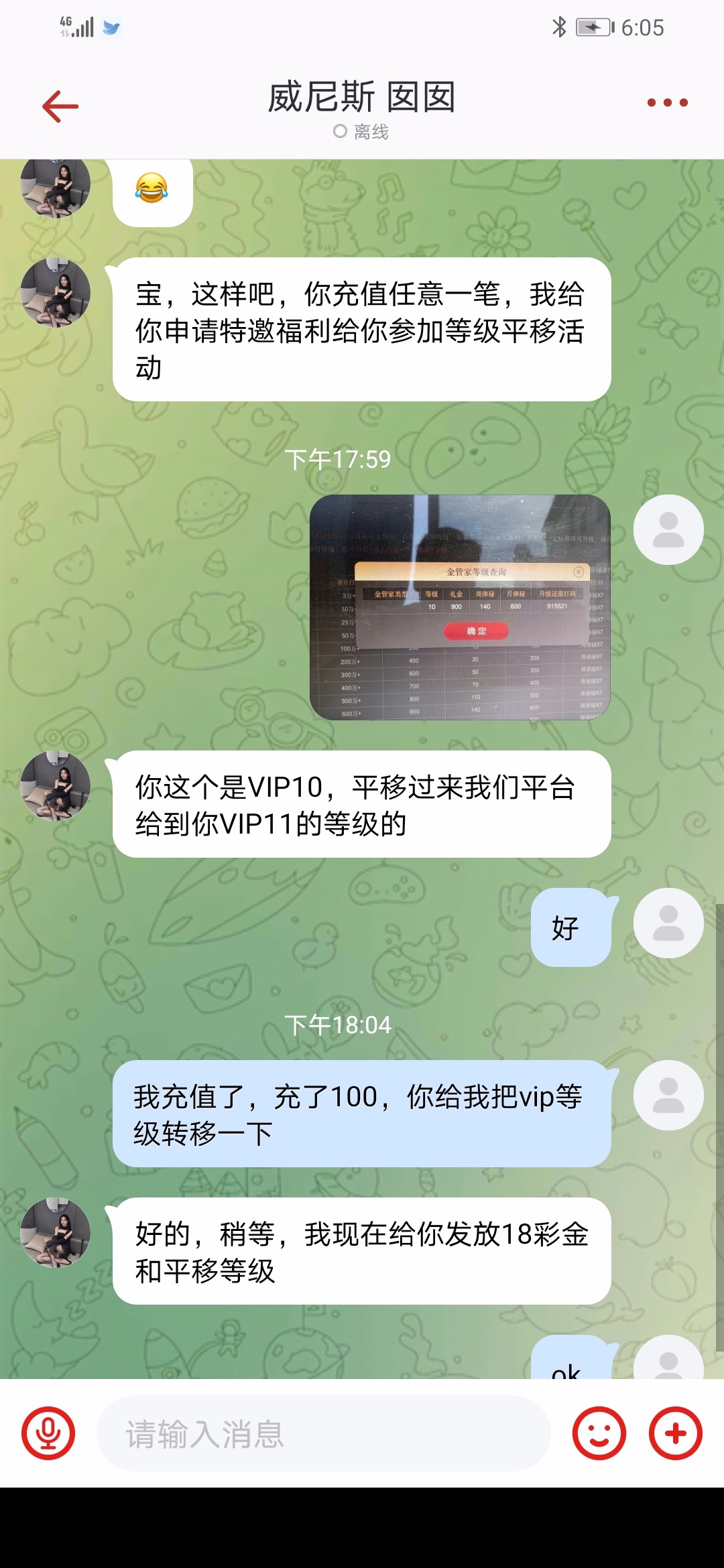 他们蓝鸽服务器是333888,直接蓝鸽联系这个专员,她的蓝鸽邀请码是77DL,然后咬定你是特邀,让他给你提升vip等级就行